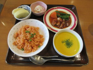 チキンライス、マーマレードローストチキン、かぼちゃポタージュ、りんご